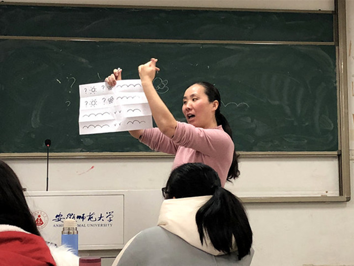 姜雪)2017年12月14日下午两点,在田家炳教育书院8202教室,2015级学前教育专业《学前儿童音乐教育》课程再次邀请一线优秀教师走进大学课堂教学。今天赵学菊老师为我们请到的主讲人是芜湖市百蕊幼儿园的杨斌园长,同时还邀请了芜湖师范学校幼儿园音乐教法任课教师王艳共同参与课程教学中。