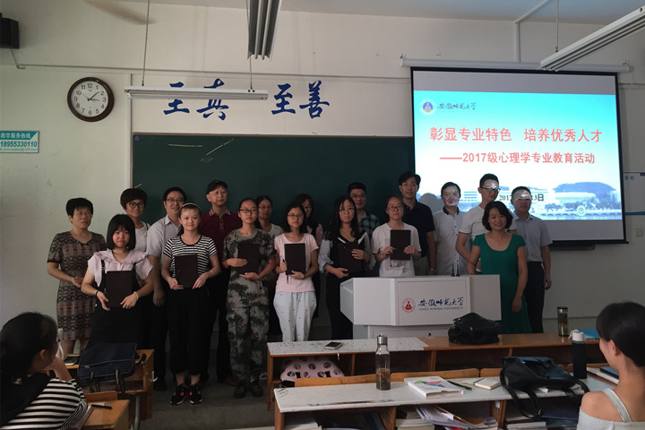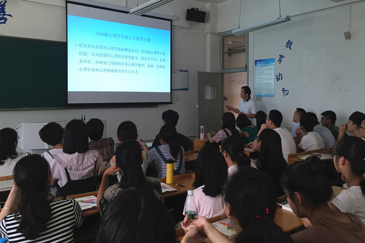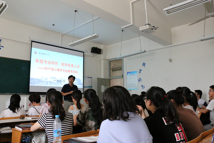 本网讯(教科院 孙文强)金风送爽,丹桂飘香。9月13日下午,我院2017级心理学专业师生见面会在田家炳楼8205召开。本次见面会由心理学专业负责人方双虎教授主持,参加本次见面会的有院长桑青松教授,心理学专业任课老师葛明贵教授、宣宾教授、罗兴根副教授、李小平副教授、郭振娟老师、徐胡燕老师、薛红利老师、孙文强老师、新生辅导员谭茹轩老师及2017级心理学专业38位莘莘学子。