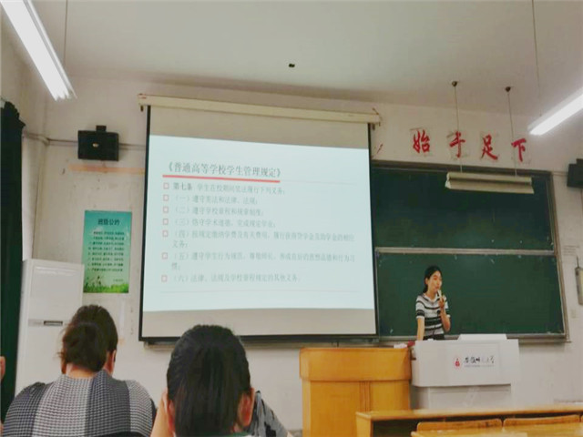 2013级辅导员马兴老师就相关规定深入讲解了学校管理规定内容,她强调学子们不仅要依法遵守相关法律法规,更是要遵守相关规定保障身体和精神两方面的健康。除此之外,马兴还对《安徽师范大学学生违纪处分规定(修订)》进行了详细的解读,同时她提出同学们要将遵纪守法的意识落实到生活的点滴中,细化到每一件小事,将学校规定牢记于心。