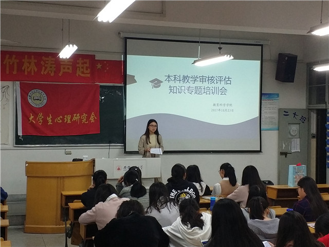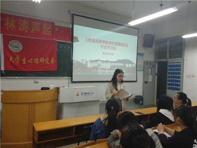 本网讯(教科院 张启山)为维护学校正常的教育教学秩序和生活秩序,规范学生管理行为,进一步提高认识,端正学生学习态度,教科院于10月24号晚,在田楼8410教室开展《普通高等学校学生管理规定》专题学习会暨本科教学审核评估知识专题培训会。此次专项会议由2016级辅导员朱雨雁老师主持。