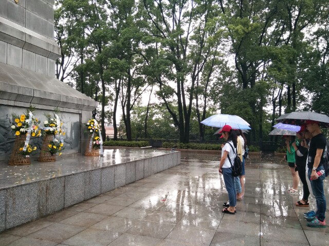 此次活动中,团队一行十一人于清晨出发,怀着对先烈的尊敬之情前往了潜山县烈士陵园。烈士陵园纪念馆里记载着潜山县的革命烈士的事迹,并陈列他们生前使用的文物。团队参观的过程中,队员们被革命烈士的英勇抗争精神深深打动。来纪念馆里参观的人络绎不绝,潜山县的主要领导也来参观了纪念馆,缅怀革命战士。队员们都认真聆听着讲解员讲述的先烈事迹和每一件文物的意义。迈步出纪念馆,眼中是威严矗立的纪念碑,上书烫金大字“人民英雄永垂不朽”,参观者纷纷撑着雨伞,在纪念碑前默哀。这个纪念碑无声歌颂者革命烈士的光辉事迹,更铭刻着我们做为后辈对革命先烈的崇高敬意,它已经成为中华民族自强不息、追求民族独立、人民解放的精神象征。