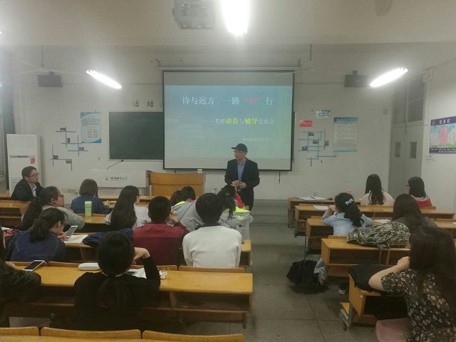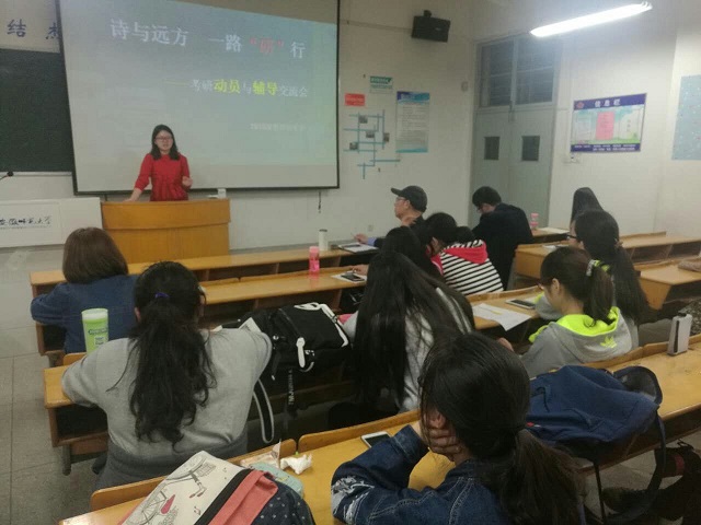 会上,两位优秀的研究生学姐和同学们分享了她们的考研经历。她们首先以自己本科班级的良好考研状况鼓励同学们积极考研,接着从四种考研类型分析了同学们可以报考的方向及学校等,最后还耐心仔细地传授了她们好的学习方法及各个科目的复习经验。