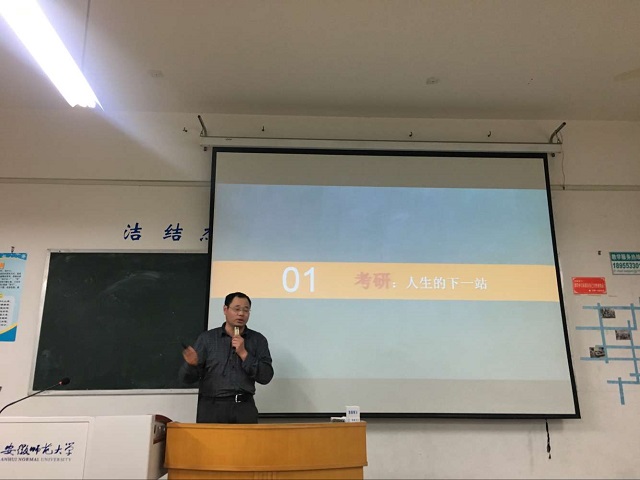 刘和海老师从学历的重要性与不可替代性讲起,强调及时提升自己的必要性并激励同学们积极准备考研。他讲解了两个主要问题:适合考研吗?考研为了什么?两个主要选择:专业的选择和学校的选择。最后他要求同学们做“有序的旅行者”,坚守住 “黎明前的黑暗”,最后必定会有所收获。