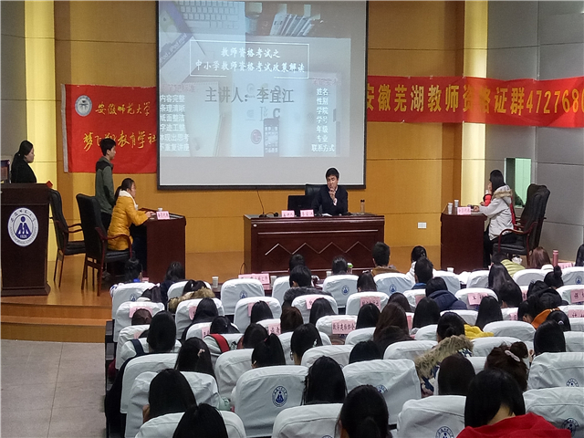 本网讯(教科院于海艳)师也者,教之以事而喻诸德也。为了使同学们加深对教师资格考试的认识,提高应试技巧,梦飞翔教育学社于12月5日晚七点在田家炳教育书院三楼学术报告厅举办了“教育漫话”系列讲座的第五讲。本次讲座的主讲人为教科院副院长李宜江教授,讲座题目是:中小学教师资格考试政策解读。讲座由2014级教育学专业高甜甜同学主持。