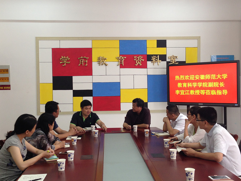 7月1日上午的交流会上,刘珂首先详细介绍了亳州学院的历史沿革、发展概况、师资建设、学科发展等情况。李宜江代表学院对亳州学院同行的热情接待表示感谢,并就学院的基本情况以及本次调研的主要目的给予介绍,就教师教育的人才培养定位、培养方案、教师资格证等热点问题和对方进行了深入交流。张更立就幼儿教师的培养问题提出了自己的看法,强调无论各层各类的学前教育专业人才培养首先要“保底”再需求“特色”和“拔高”,不能本末倒置。亳州学院教育系主任包根胜重点介绍了该校学前教育专业实训室建设的情况,借助学校发展的系列机遇,现已建成儿童行为心理观察室、蒙台梭利教育实训室、婴幼儿卫生保健实训室、学前教育微格教室、幼儿游戏实训室、感觉统合教育实训室、亲子教育实训室、奥尔夫音乐教育实训室、书法技能实训室、画室、手工室、服装道具室等24个实训室并陆续投入使用。双方就实训室建设和使用展开了交流。会后,调研组一行在亳州学院教育系负责人陪同介绍下,实地走访了该校20多个学前教育专业实训室等场所。