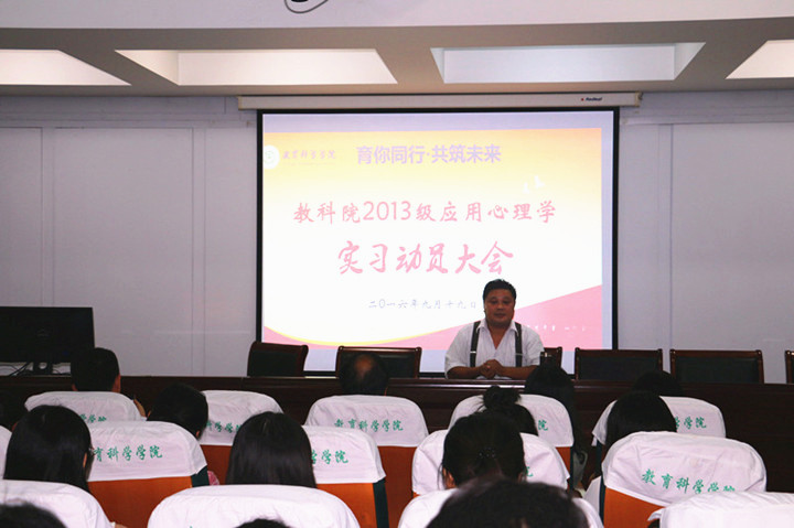 本网讯(教科院 李书婷)为贯彻落实学校学院的人才培养方案,切实提升同学们的专业实践能力,为做好2013级应用心理学专业实习工作,2016年9月19日晚上8:00,教育科学学院在赭山校区教科院学术交流中心召开了2013级应用心理学专业实习动员大会。应用心理学专业负责人桂守才老师、各实习点指导教师以及2013级应用心理学专业全体本科生参加了大会。会议由桂守才老师主持。