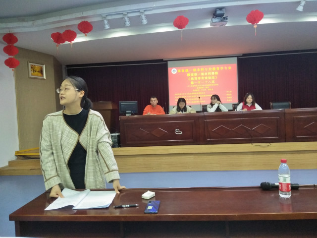 最后一位汇报人李新蕊以《“四位一体”教育实习激励机制构建研究》为题,剖析了教育实习激励机制现存问题及其原因,并提出双向共赢、三方协同、四体联动的“四位一体”教育实习机制。四位同学的汇报结束后,进入集体讨论环节,大家积极发言,热烈讨论,在思维的交流与碰撞中不断接近真理。