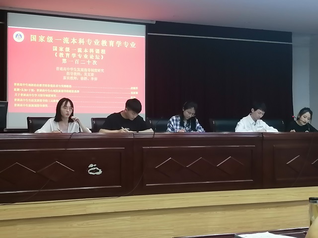 本网讯(文/魏珍 图/张思雪)为锻炼学生专业能力,培养学生学术造诣。5月9日晚,国家级一流本科专业教育学专业于图书馆报告厅举办第一百二十次专业论坛。此次专业论坛由18级教育学黄跃程主持,18、19、20级教育学专业全体同学到场参加。此外,莅临本次专业论坛的还有嘉宾老师李卯老师、徐群老师,以及指导老师吴支奎老师。主持人介绍完论坛流程和会场纪律后,专业论坛正式开始。