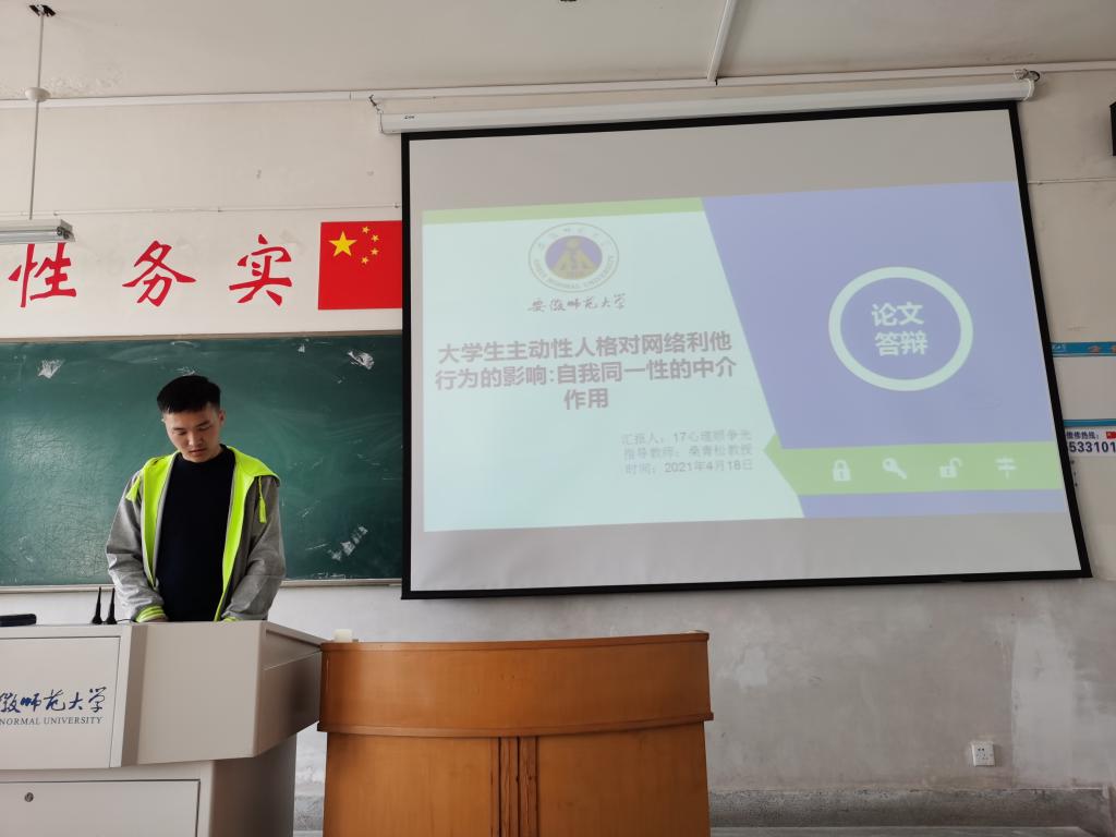 本网讯(教科院马润生)2021年4月18日下午2:30,2017级心理学(师范)专业和应用心理学专业第一轮本科毕业论文答辩在田楼二楼各教室举行。本次答辩分六组同步进行,答辩委员由心理学专业葛明贵、宣宾等十八位老师组成。
