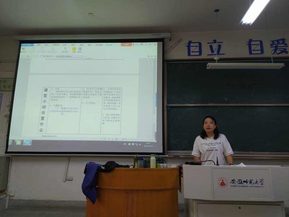 5月25日晚,芜湖师范附小的芮欣老师莅临8309教室进行指导。首先由参赛选手进行小学英语学科的无生上课,接着芮老师运用精准的语言从小学英语课程教学理念、教学目标、教学过程、教学方法和技巧等多方面进行分析点评,帮助同学们多角度构建语言框架,提升英语教学基本素养。