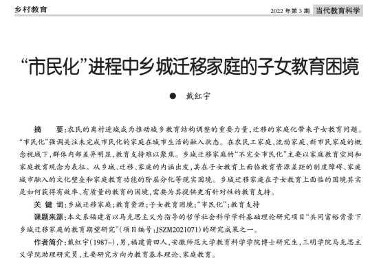 农民的离村进城成为推动城乡教育结构调整的重要力量,迁移的家庭化带来子女教育问题。“市民化”强调关注未完成市民化的家庭在城市生活的融入状态。在农民工家庭、流动家庭、新市民家庭的概念视域下,群体内部差异明显,教育支持难以聚焦。乡城迁移家庭的“不完全市民化”主要以家庭教育空间和家庭教育观念为表征。从乡城、迁移、家庭的内涵出发,其在子女教育上面临教育资源差距的制度障碍、家庭城市融入的文化壁垒和家庭教育功能的阶层分化等现实困境。乡城迁移家庭在子女教育上面临的困境其实是如何获得有效率、有质量的教育的困境,需要为其提供更有针对性的教育支持。