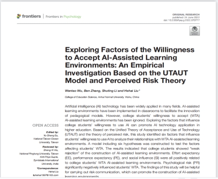 Artificial intelligence (AI) technology has been widely applied in many fields. AI-assisted learning environments have been implemented in classrooms to facilitate the innovation of pedagogical models. However, college students’ willingness to accept (WTA) AI-assisted learning environments has been ignored. Exploring the factors that influence college students’ willingness to use AI can promote AI technology application in higher education. Based on the Unified Theory of Acceptance and Use of Technology (UTAUT) and the theory of perceived risk, this study identified six factors that influence students’ willingness to use AI to analyze their relationships with WTA AI-assisted learning environments.