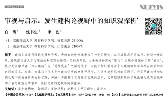 建构主义学习理论发展到今天,为教育教学改革带来了一定的影响,其积极作用不可忽视。但进一步反思,发现建构主义学习理论的知识观也存在一定的局限性:大多关注知识的“建构”,而较少关注知识的“发生”;较少关注学习者“知识建构”与“思维发生”之间的关系;未能平衡好学习者个人建构的知识与社会共同知识之间的关系。为此,文章以皮亚杰发生建构论为起点展开思考,在发生建构思想的关照下,分别从建构性和结构性两个视角探析新的知识观,并进一步阐释了其对教学实践的启示。文章期望新的知识观能够为教育实践中学习者思维能力的培养、高阶思维的发展等提供指导。