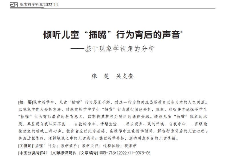 课堂教学中,儿童“插嘴”行为屡见不鲜,对这一行为的关注凸显教育以生为本的人文关照。以现象学作为分析方法,对课堂教学中学生“插嘴”行为进行阐述分析,观察、聆听并尝试探寻学生“插嘴”行为背后潜在的教育意义,以期将其转换为鲜活的课程资源。透视儿童“插嘴”现象的本质,其呈现自我认同不良——自救的呻吟、情绪宣泄——寻求观点一致的呼唤、自我中心——班级地位建立的呐喊三种心声。教育者应以此为基础,在教学中注重教学倾听,解密行为背后的儿童心理;关注过程体验,理解境域之中的儿童感受;施以教学关怀,洞悉瞬息多变的儿童情绪。