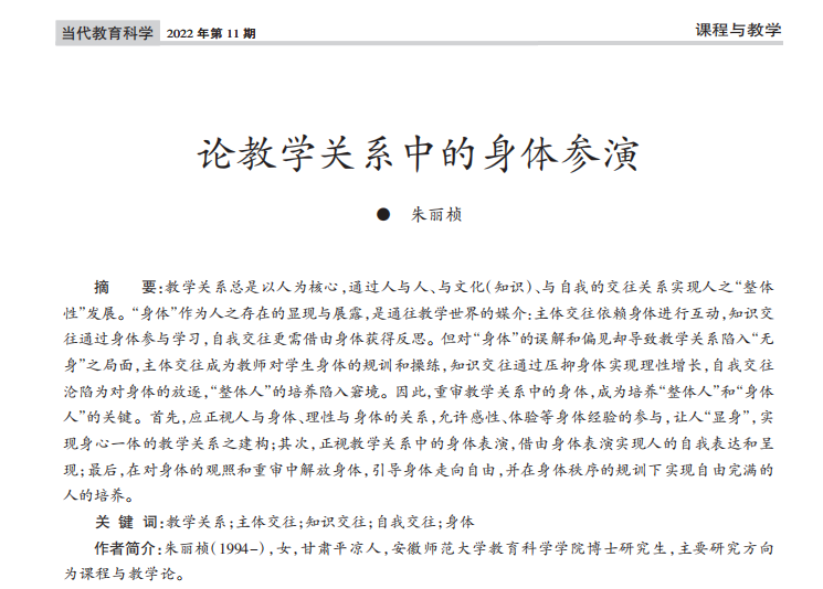 教学关系总是以人为核心,通过人与人、与文化(知识)、与自我的交往关系实现人之“整体性”发展。“身体”作为人之存在的显现与展露,是通往教学世界的媒介:主体交往依赖身体进行互动,知识交往通过身体参与学习,自我交往更需借由身体获得反思。但对“身体”的误解和偏见却导致教学关系陷入“无身”之局面,主体交往成为教师对学生身体的规训和操练,知识交往通过压抑身体实现理性增长,自我交往沦陷为对身体的放逐,“整体人”的培养陷入窘境。因此,重审教学关系中的身体,成为培养“整体人”和“身体人”的关键。首先,应正视人与身体、理性与身体的关系,允许感性、体验等身体经验的参与,让人“显身”,实现身心一体的教学关系之建构;其次,正视教学关系中的身体表演,借由身体表演实现人的自我表达和呈现;最后,在对身体的观照和重审中解放身体,引导身体走向自由,并在身体秩序的规训下实现自由完满的人的培养。