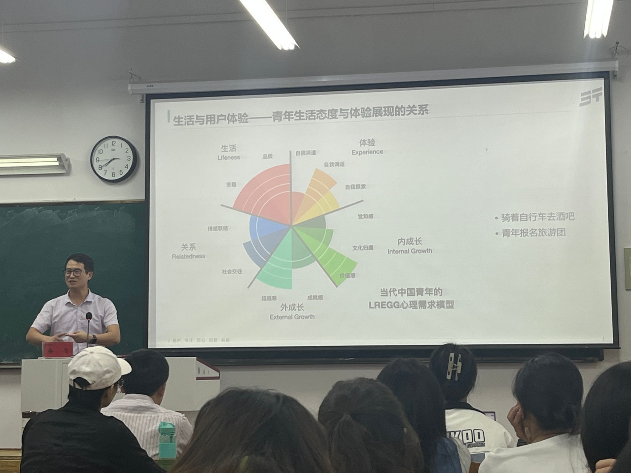 接着,徐飞分享了自身经历。他回忆自己走出安徽师范大学后,抓住研究“用户体验”的机遇,不断地进行探索,虽然期间经历过迷茫、彷徨,但凭借自身强大的学习动力,他最终摆脱了困境。他以ChatGPT为切入点,给同学们阐明用户体验的定义、作用、以及重要性,还列举了一些以用户体验为基础,可量化的眼动仪制作的广告,来帮助同学们理解用户体验如何切实提高广告的点击率以及企业收益。不仅如此,徐飞还向大家介绍了不同类型的用户体验,如:动机与驱动型体验、记忆与驱动型体验、满足用户健康需求的体验、以及满足用户商业需求的体验等等。为了方便同学们更好地理解,徐飞给大家举例用户需求行业内新改进的app:蜻蜓fm。此外,徐飞老师给大家讲述了用户体验的就业前景以及相关岗位。他还鼓励大家不断深挖专业,提升自信,精进自我,多去尝试学习一些跨领域技术,来增添自己未来的就业优势,使自己成为复合型人才,更好地奉献于社会。