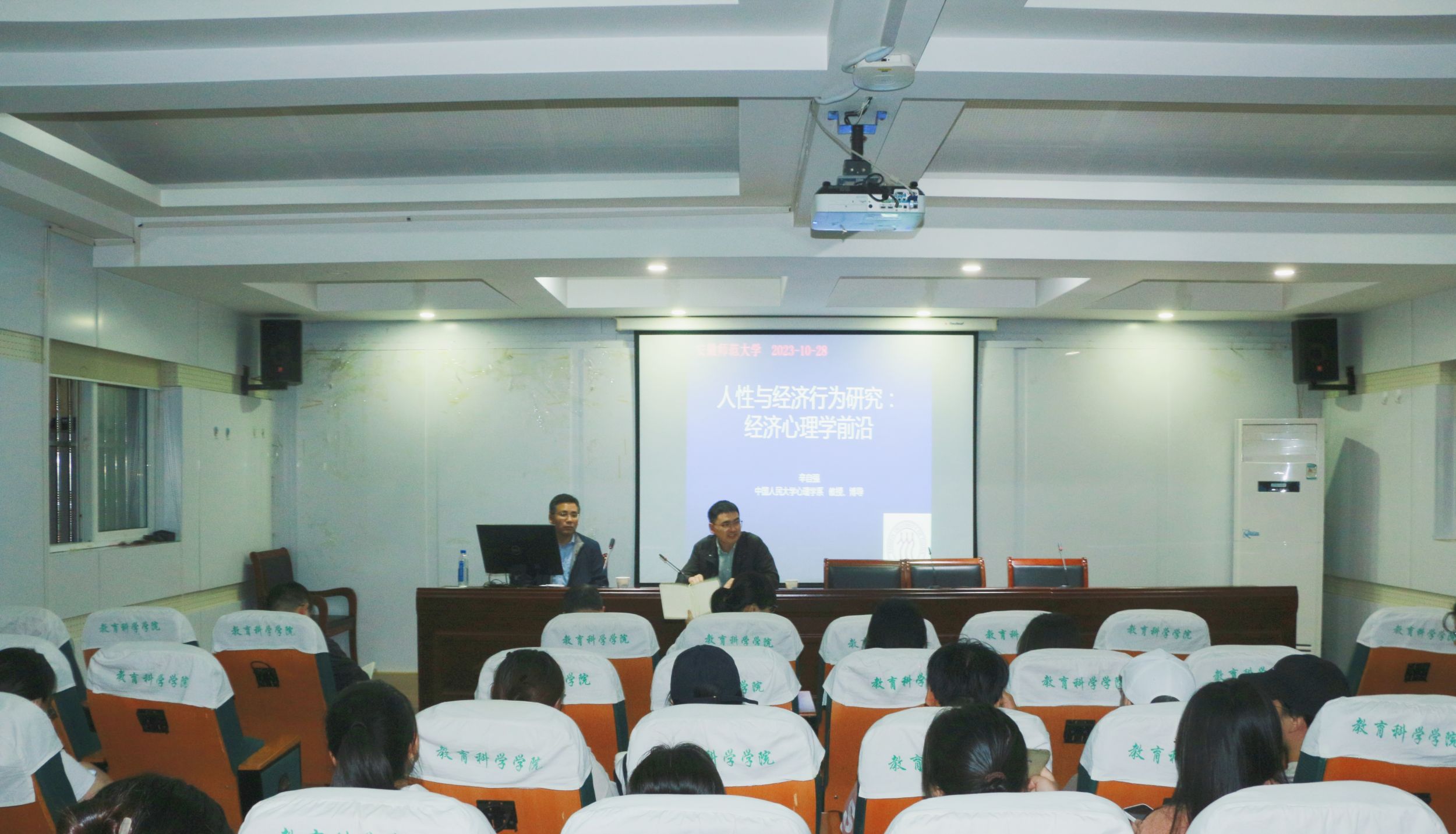 10月28日下午,皖江心理大讲坛第一百零六讲报告会在教育科学学院学术交流中心如期开展。本次报告会的主题是由中国人民大学心理学系主任、辛自强教授所带来的《人性与经济行为研究:经济心理学前沿》。报告会由韩建涛副院长主持,学院部分教师出席了本次报告会, 2023级心理学研究生到场聆听。