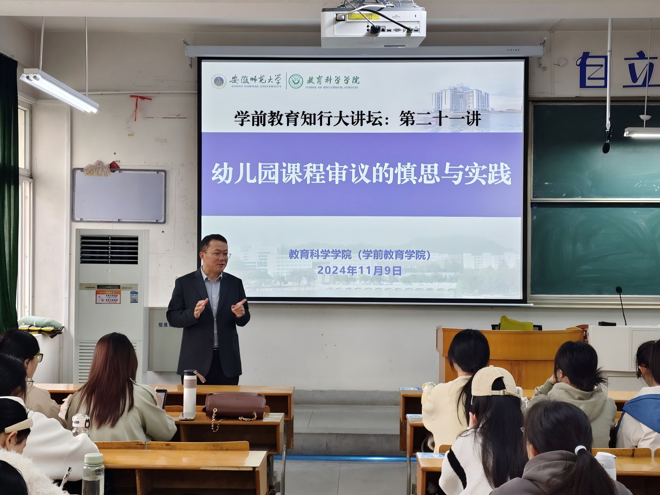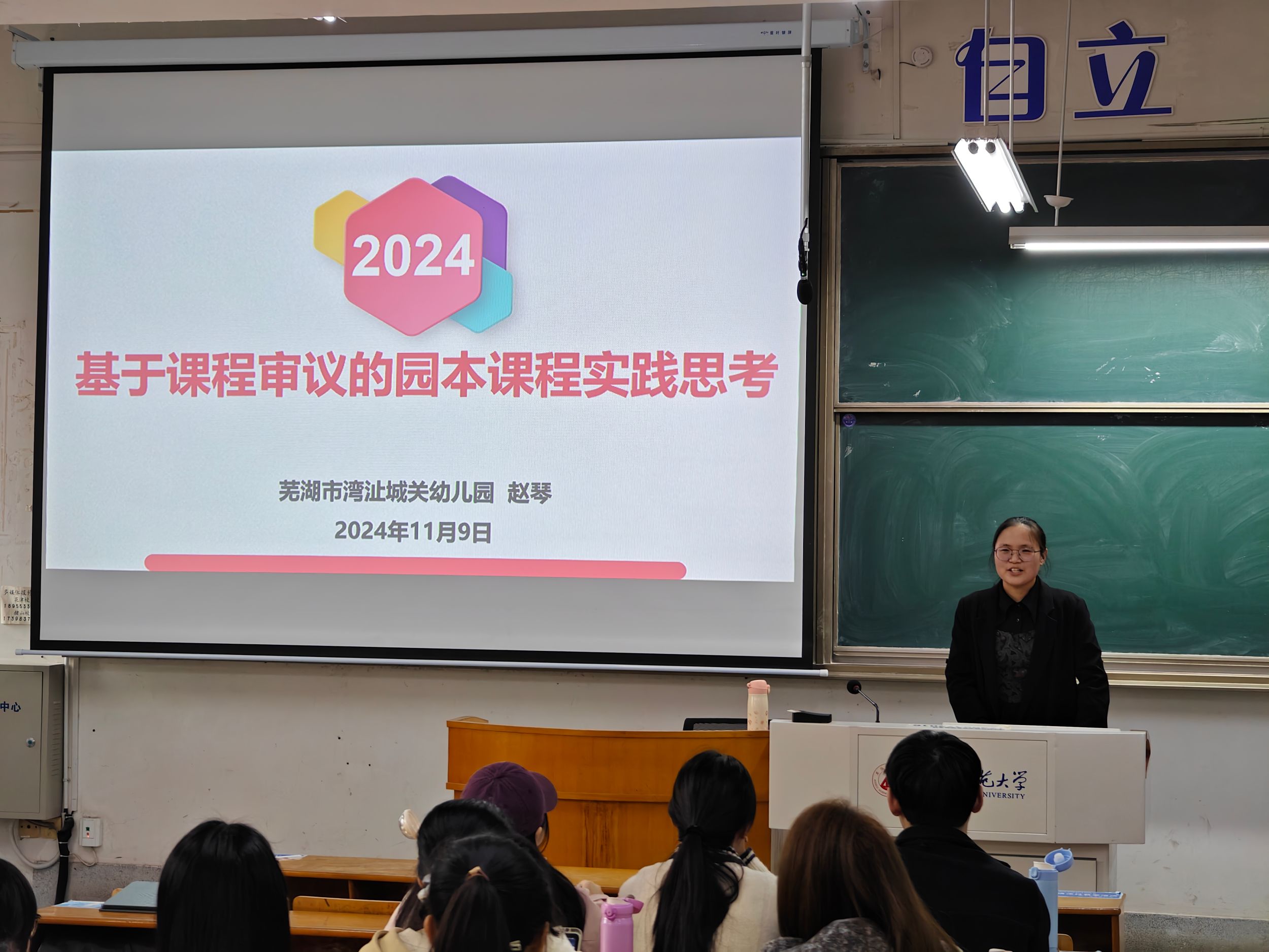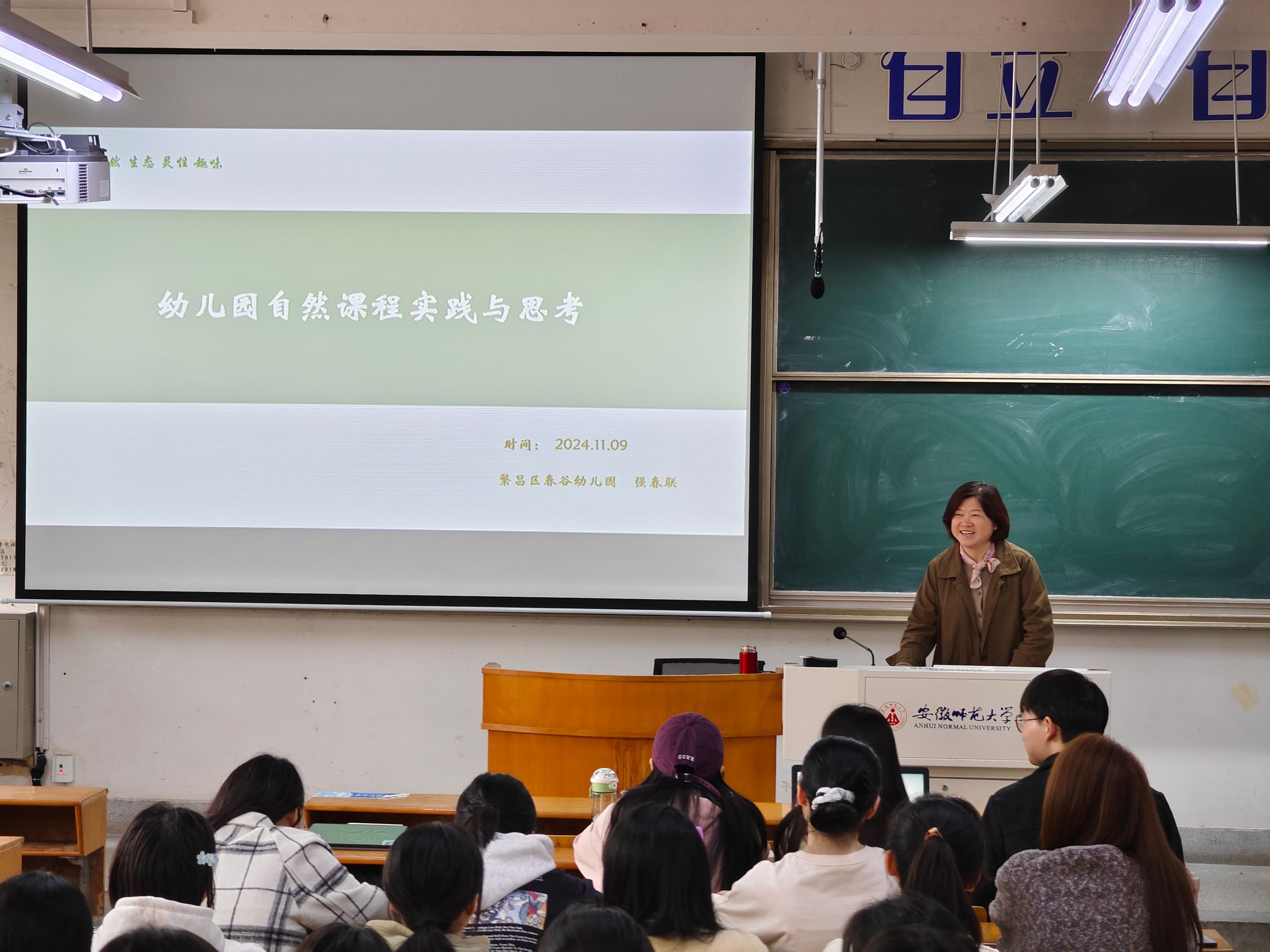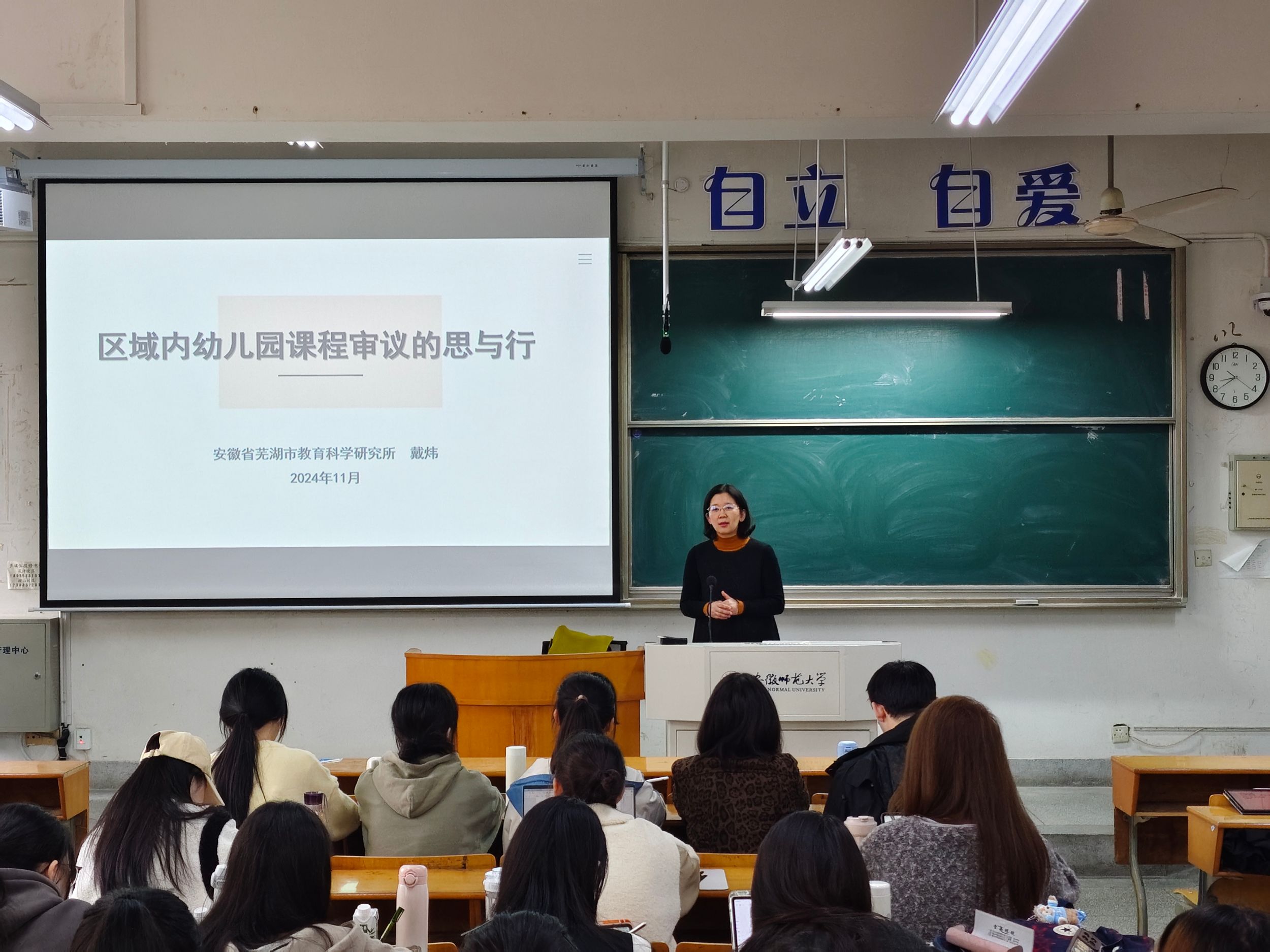 2024年11月9日,学前教育知行大讲坛第二十一讲在田楼8210教室举行。本次讲座邀请芜湖市教育科学研究所副所长、硕士生导师戴炜,繁昌区春谷幼儿园园长强春联、湾沚城关幼儿园园长赵琴,围绕《幼儿园课程审议的慎思与实践》为我院师生做了三讲专题讲座。讲座由教育科学学院(学前教育学院)副院长张更立教授主持,2023级、2024级学前教育研究生及部分本科生到场学习。