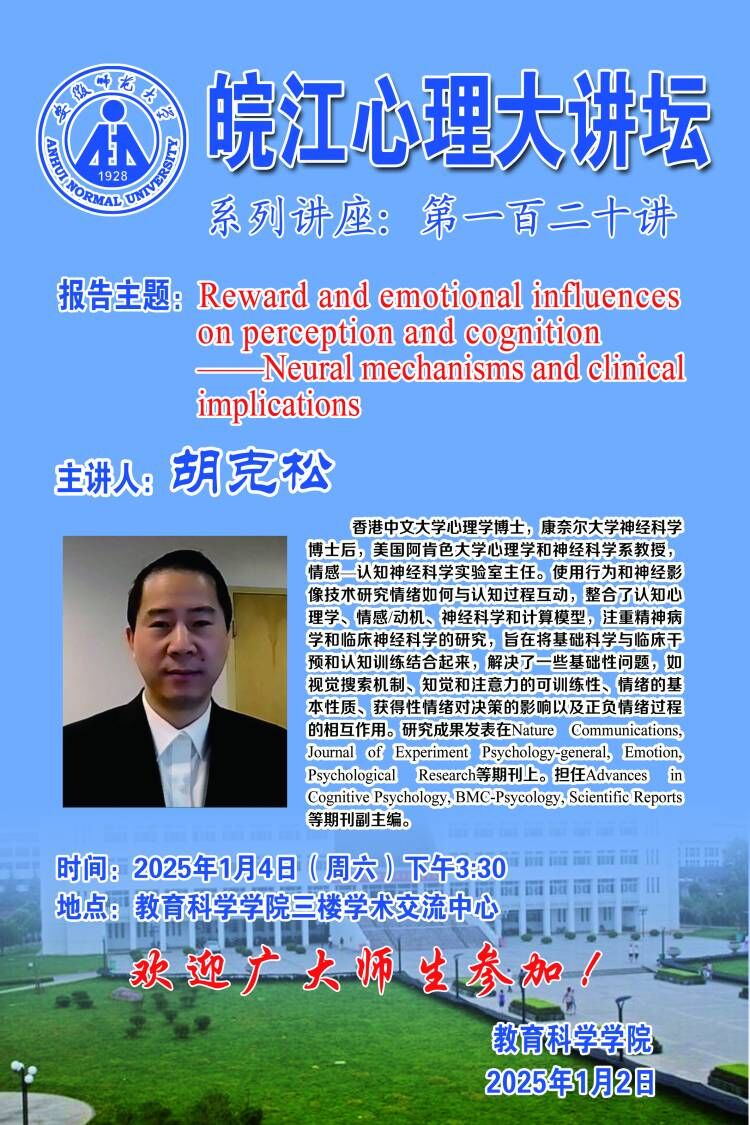 【学术预告】皖江心理大讲坛第一百二十讲——胡克松:Reward and emotional influences on perception and cognition——Neural mechanisms and clinical implications