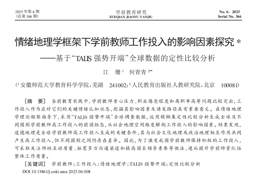 当前教育实践中,学前教师身心压力、职业倦怠程度和离职率高等问题比较突出,工作投入作为应对它们的关键情绪认知状态,挖掘其影响因素及诱发路径具有重要意义。在情绪地理学理论框架指导下,采用“TALIS 强势开端”全球调查数据,运用模糊集定性比较分析生成全球及不同国别学前教师高工作投入的前因组态,从社会地理空间维度解构工作投入的影响因素。结果发现,道德地理是全球学前教师高工作投入生成的关键条件,其与社会文化地理或政治地理相互作用共同产生高工作投入,但不同国别之间仍存在差异。因此,为了激发我国学前教师保持积极的工作投入,可采取关注师幼互动质量、拓宽多方沟通渠道和提高园长领导素养等做法,进而提升学前师资队伍整体工作质量。