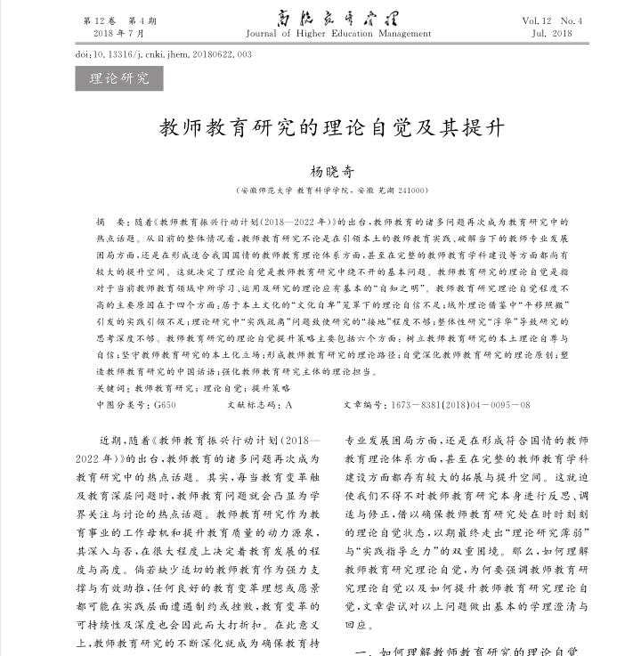 杨晓奇:教师教育研究的理论自觉及其提升