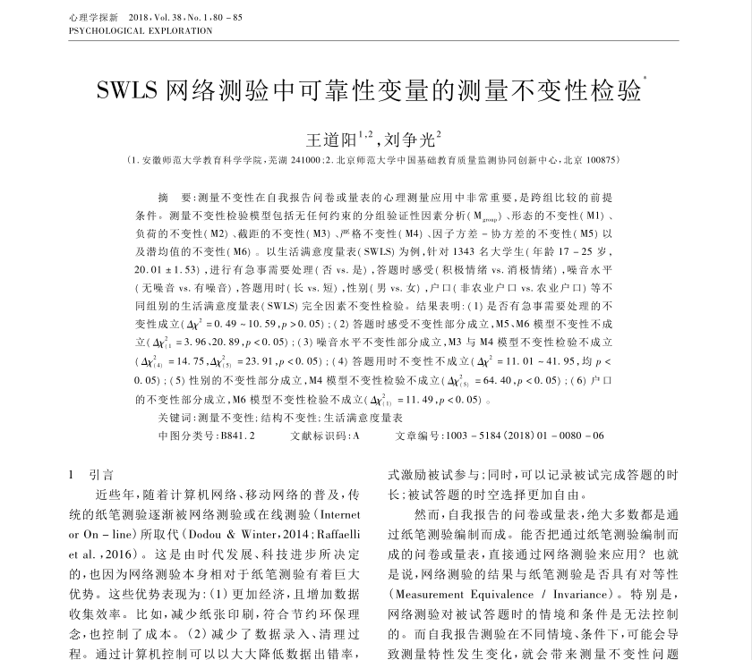 SWLS网络测验中可靠性变量的测量不变性检验_王道阳.pdf