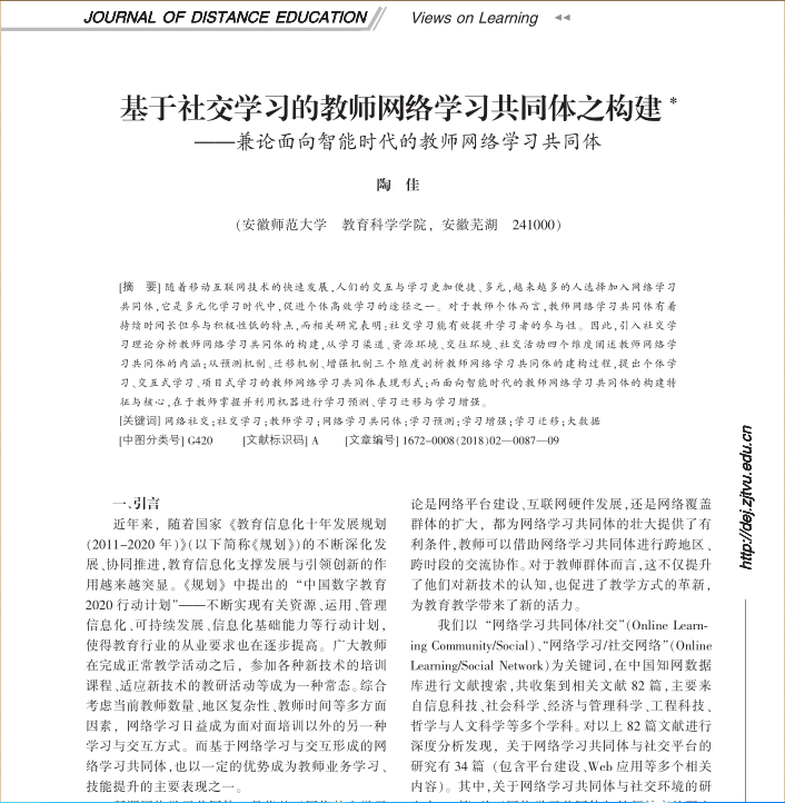 陶佳:基于社交学习的教师网络学习共同体之构建——兼论面向智能时代的教师网络学习共同体