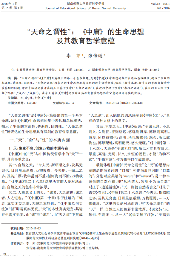李 卯,张传燧:天命之谓性”《中庸》的生命思想及其教育哲学意蕴
