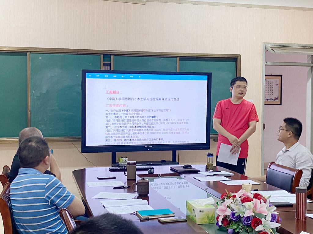 李卯做了题为“《中庸》学问思辨行:本土学习过程观阐释及现代意蕴”的汇报,主要围绕三个问题进行论述:为什么把《中庸》学问思辨行看作是“本土学习过程观”,学问思辨行”的内涵(义理)及特点,以及学问思辨行“本土学习过程观”的现代意蕴。汇报结束后,柯文涛、周兴国、辛治洋、戴红宇等先后对汇报内容提出自己的观点与困惑之处,李卯对相应问题进行答疑与论述。