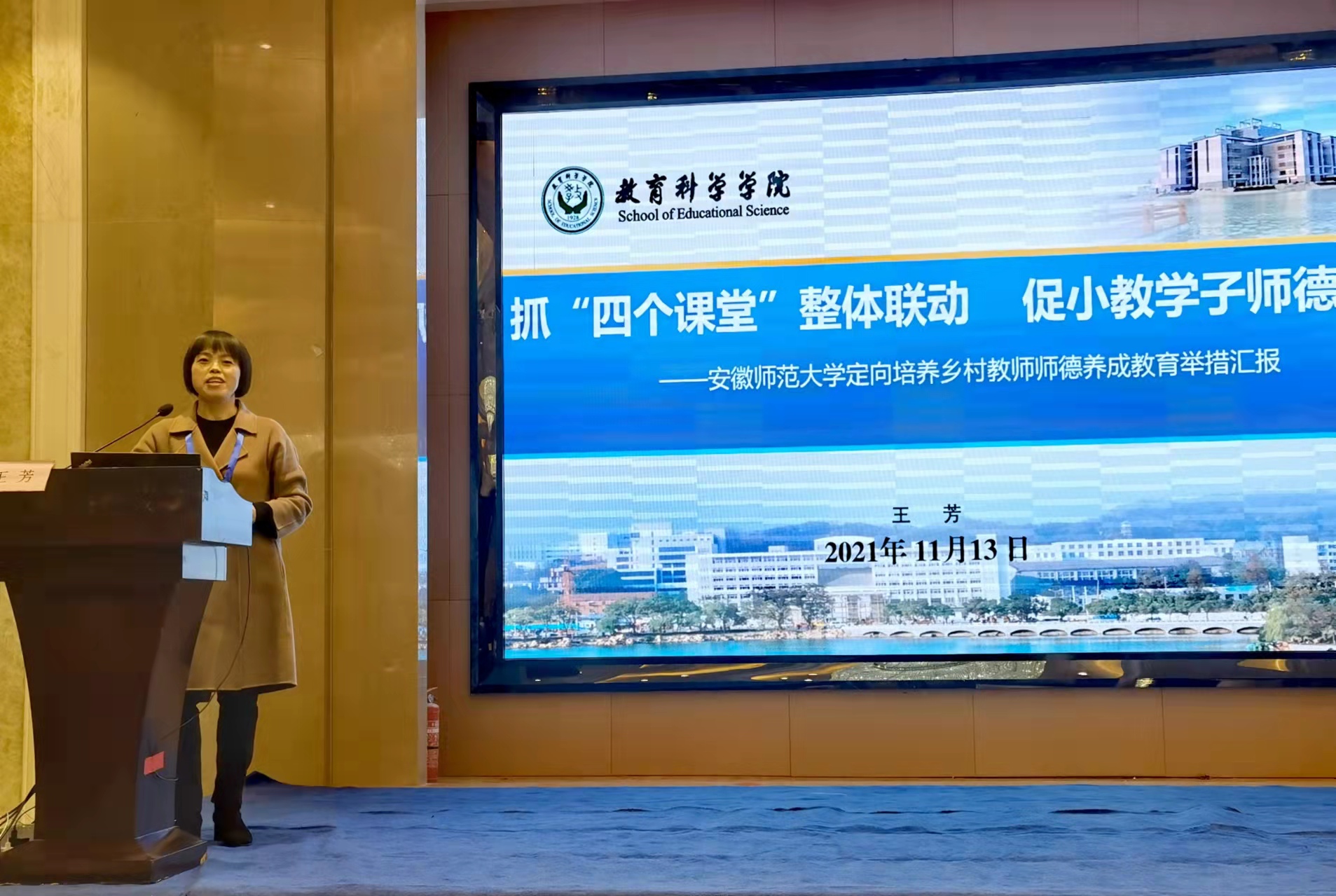 教科院李宜江教授、王芳副教授、李卯副教授受邀分别作了“教师教书育人能力素质:内涵及提升路径”“抓‘四个课堂’整体联动、促小教学子师德养成”“基于师范生教育情怀涵养的《中学教育基础》课程思政理论与实践探索”等三个大会专题报告,并就教师教育改革与发展中的相关理论和实践问题与参会专家学者进行了广泛地交流。