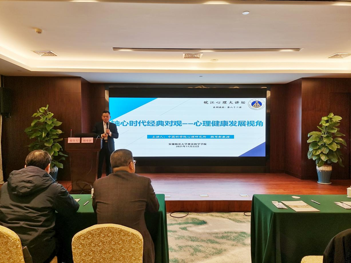 本网讯(教科院 文/桂先梅 图/王丽 江雨潜)11月22日上午,皖江心理大讲坛第八十三讲在铁山宾馆松苑二楼弋江厅如期举行,中国科学院心理研究所博士生导师、中国心理学会前任理事长韩布新研究员应邀作《轴心时代经典对观——心理健康发展视角》学术报告。讲座由我院心理语言学博士点负责人、心理学一级学科硕士点负责人、博士生导师葛明贵教授主持,心理学系桑青松教授、方双虎教授、宣宾教授等,以及心理学硕士研究生和心理健康教育专业硕士研究生等近70名师生到场聆听学习。