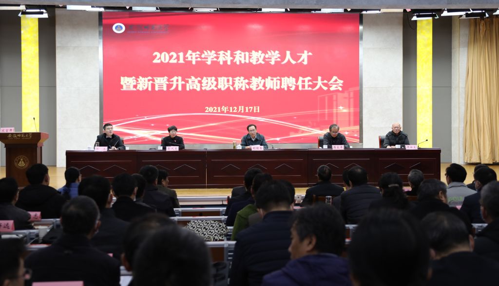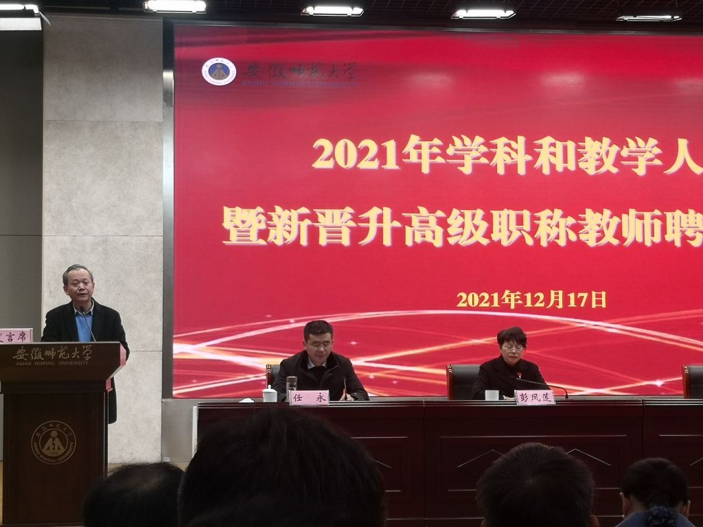 2021年12月17日下午,安徽师范大学2021年学科和教学人才暨新晋升高级职称教师聘任大会在花津校区实习实训中心一楼报告厅隆重召开。校领导胡朝荣、蒋家平、彭凤莲、周新发、任永出席会议,校党委常委、办公室主任曾黎明,纪委办、组织部、宣传部、发展规划处、人事处、教务处、科研处、研究生院等部门主要负责人,各学院党委书记、院长,2021年聘任的学科和教学人才,2021年新晋升高级职称教师,各学院教师代表300余人参加会议。校党委常委、副校长任永主持聘任大会。