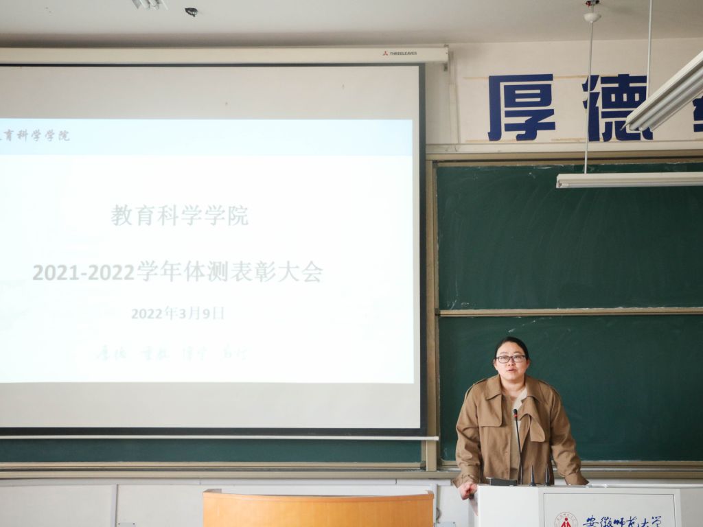 为了促进学生加强体育锻炼,积极实施德智体美劳“五大行动”。3月9日下午,教育科学学院于田楼8202教室召开2021年-2022学年体测表彰大会。学院党委副书记杜凤、院团委书记程啸、副书记蔡文、21级辅导员张理强、院学生会体育部工作人员以及受表彰的全体同学参加,2020级小学教育专业张琦主持。