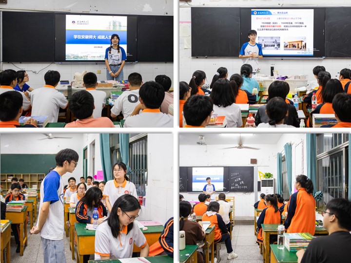 访谈结束后,队员面向高二升入高三的文理科共十八个班级展开招生宣讲工作。队员们播放了安徽师范大学2022年招生宣传片与校长致辞,从“师大怎么样”、“今年招什么”、“专业怎么录”、“信息哪里查”四个方面进行了具体介绍,鼓励同学们更全面地了解安徽师范大学,预祝同学们在2023年高考中取得满意成绩,欢迎大家报考安徽师范大学。