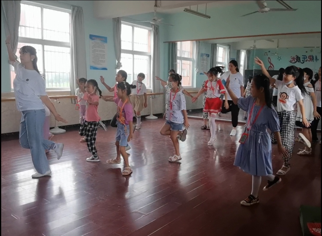 “一二三四五六七八、二二三四五六七八”,伴随着欢快的音乐声,志愿者姚佳茜和张泠带领着舞蹈班学生进行热身运动。舞蹈课上,她们先教授学生们一些基础的舞蹈动作,然后将复杂的舞蹈动作逐一分解。孩子们模仿老师的动作,随着旋律旋转、跳跃,轻盈的舞蹈梦也悄悄在心间种植。