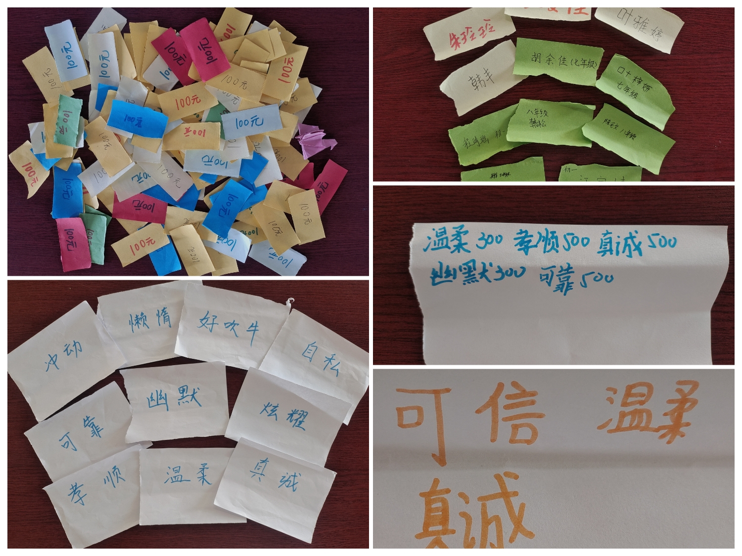 接下来,团队进行了一个名为“品质拍卖会”的活动活动开始,学生会得到一些虚拟纸币,这些“虚拟”纸币均是由大家共同合作完成。进入拍卖环节,每个同学都有机会使用手中的纸币竞拍自己认为最珍贵的品质。进行两次拍卖后,课堂气氛变得十分活跃,大家积极地分享了竞拍各种品质的原因,并表达了对朋友的期望。队员和孩子们也在一次次拍卖活动中收获幸福与快乐。