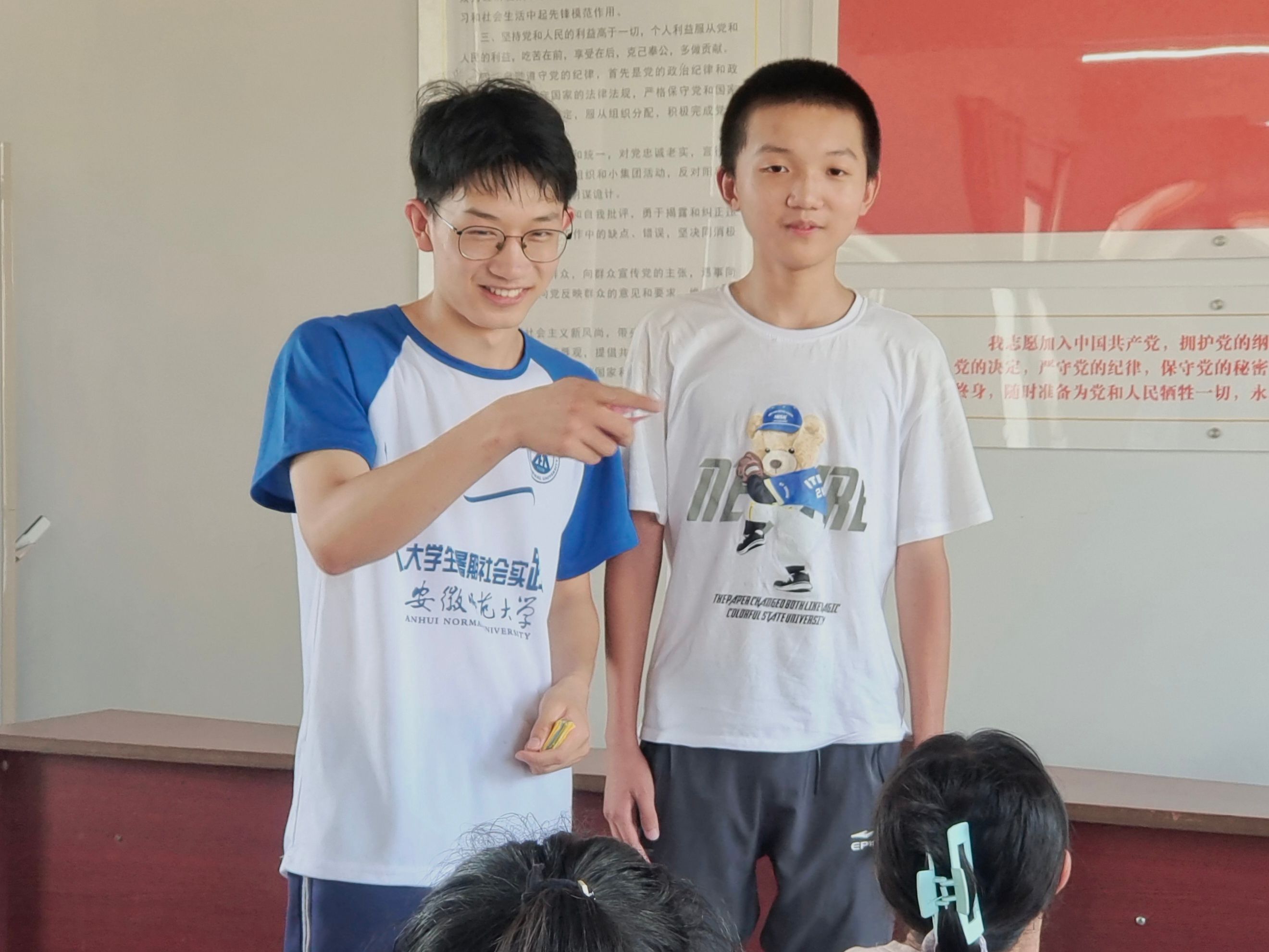 课程开始前,队伍中的心理老师余旭了解到,参加本次暑期课程的学生在此之前还没有上过一次心理课,在老师的提问下也略显腼腆,不敢发言。为了活跃课堂气氛,余旭和徐航两位队员组织了“击鼓传花”的热身游戏,他们以一只粉色千纸鹤为“花”,每次计时结束时,传到“花”的小朋友们都会上台展示自己的才艺。游戏紧张地进行着,期间陈毛文小朋友背诵了一首《泊秦淮》,王姿佳小朋友演唱了歌曲《可能》。渐渐地,学生们拘谨的姿态也逐渐放松下来。