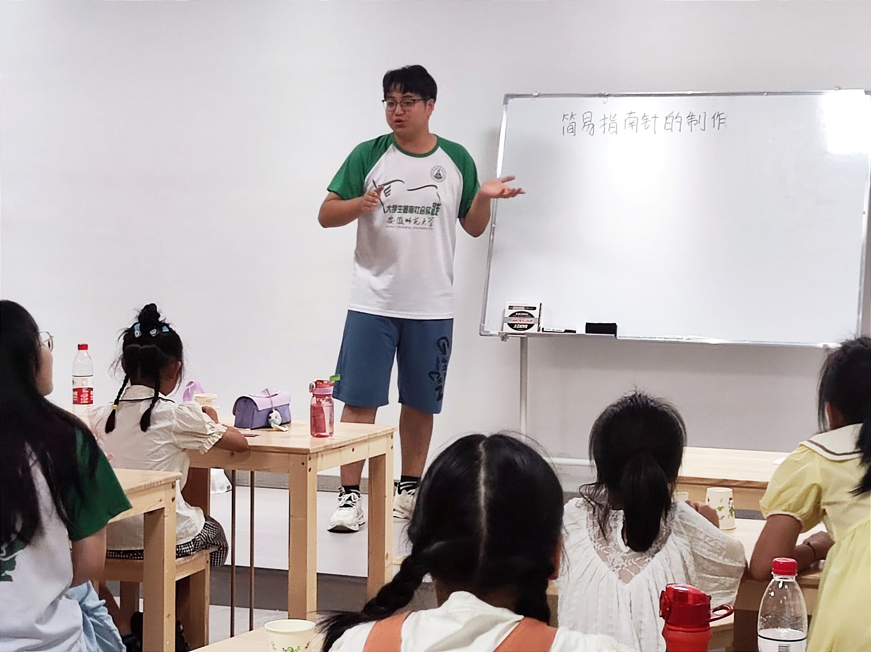 在物理课上,周旭利用水杯、水、纸片、磁铁、回形针等工具教导同学们制作简易的指南针,通过有趣的实验让学生们从动手实践中掌握磁铁的特点,并明白了它的原理:地球拥有磁场才能让带有磁性的回形针指向南方。