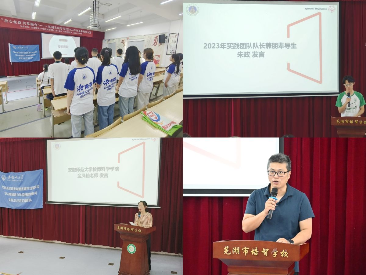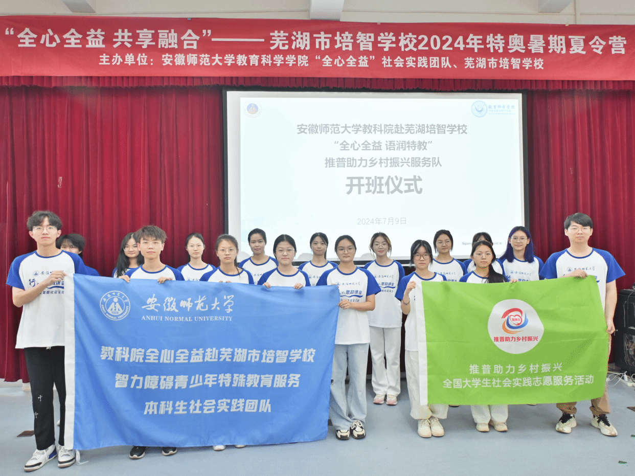 青春献特教,培智育新芽。为关爱特殊教育青少年群体,贡献大学生青春力量,助推国际特奥项目的开展,教育科学学院“全心全益”赴芜湖培智学校暑期社会实践团队顺利举行开班仪式,帮助18名智力障碍青少年生涯启航,提升个人素养,促进健康成长。