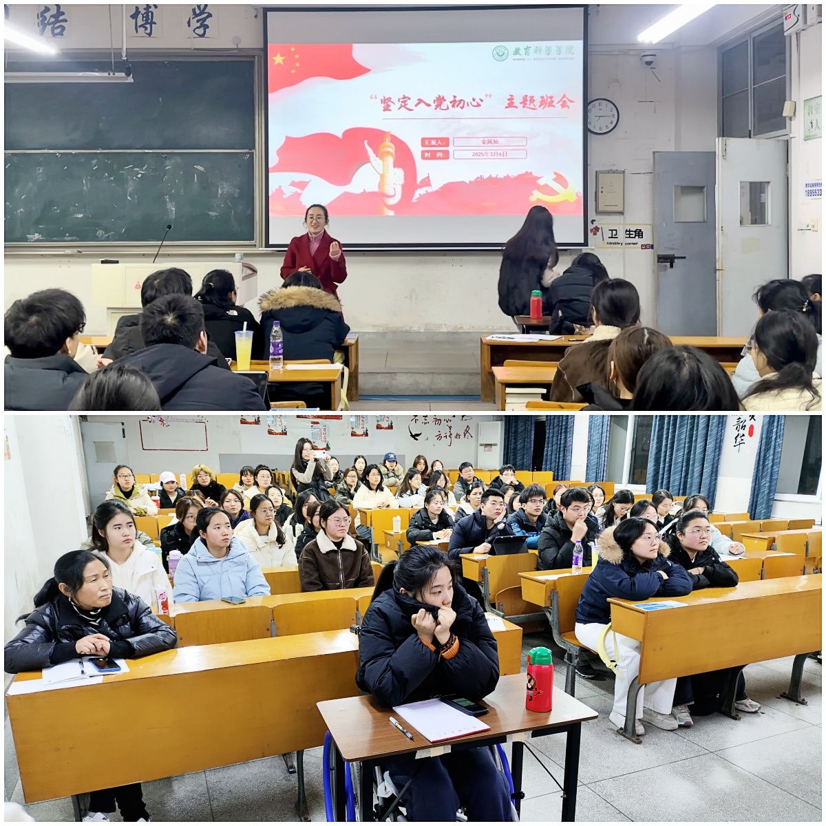 主题班会围绕“发展党员工作原则”“发展党员工作流程”“六维一体发展指标”以及“学生党员代表发言”四个方面展开。