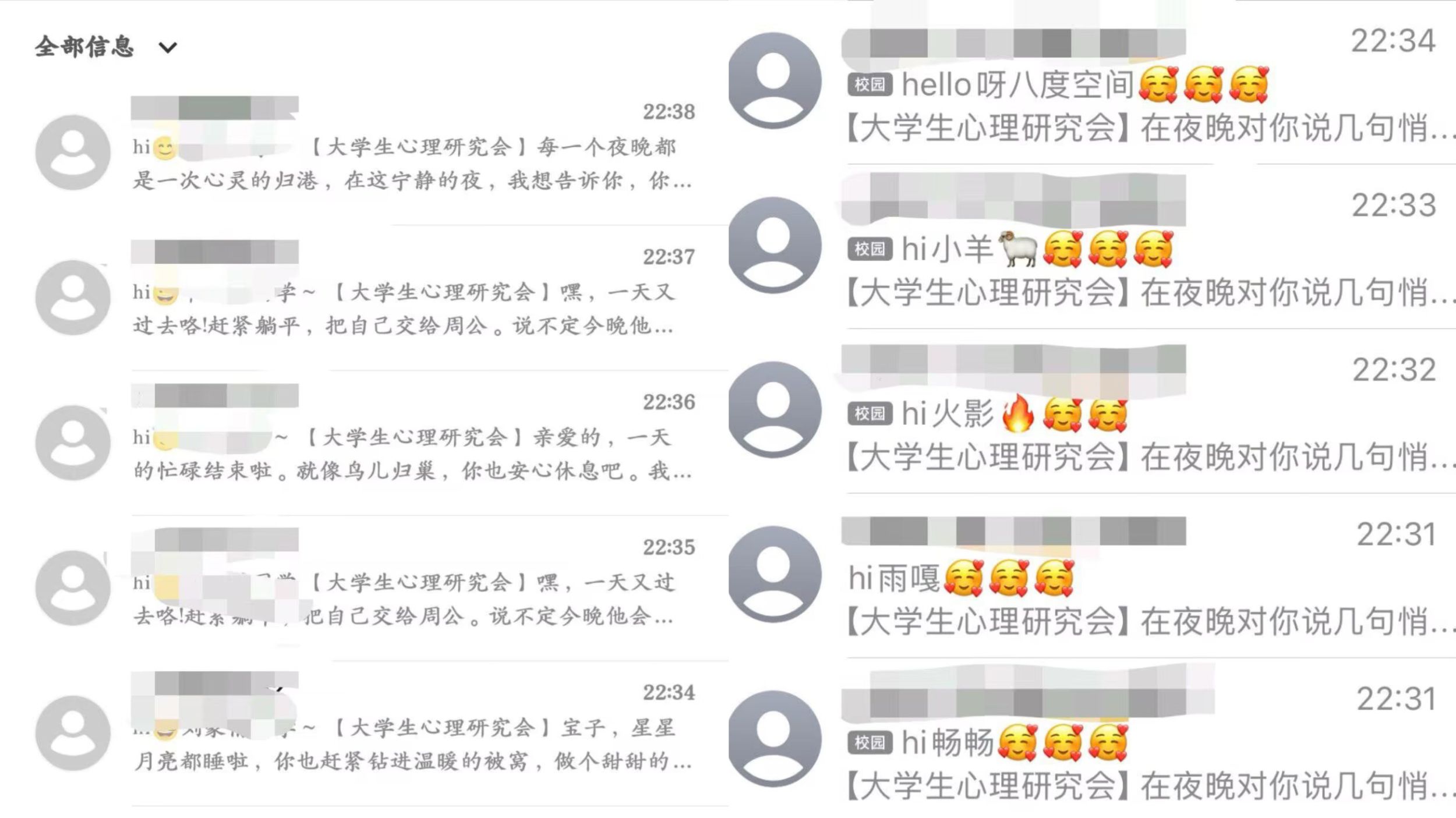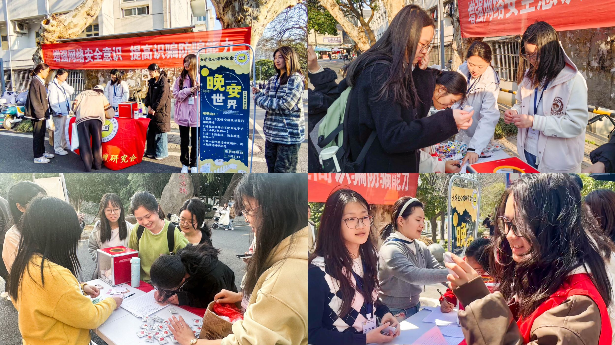 3月20日至3月21日,“晚安短信”活动将本次“321睡眠日”活动推向了高潮。活动当天,大学生心理研究会在食堂广场摆设展台,吸引了两百多名同学参与其中,大家在便签纸上写下昵称和手机号,投入纸箱,随后抽取其他同学的联系方式,在晚上向抽取到的号码发送晚安短信送上好梦祝福,充满了温暖与关怀。大学生心理研究会的工作人员也为所有报名活动的同学发送了官方短信,其中包含助眠小贴士,为同学们送去了一份特别的问候。