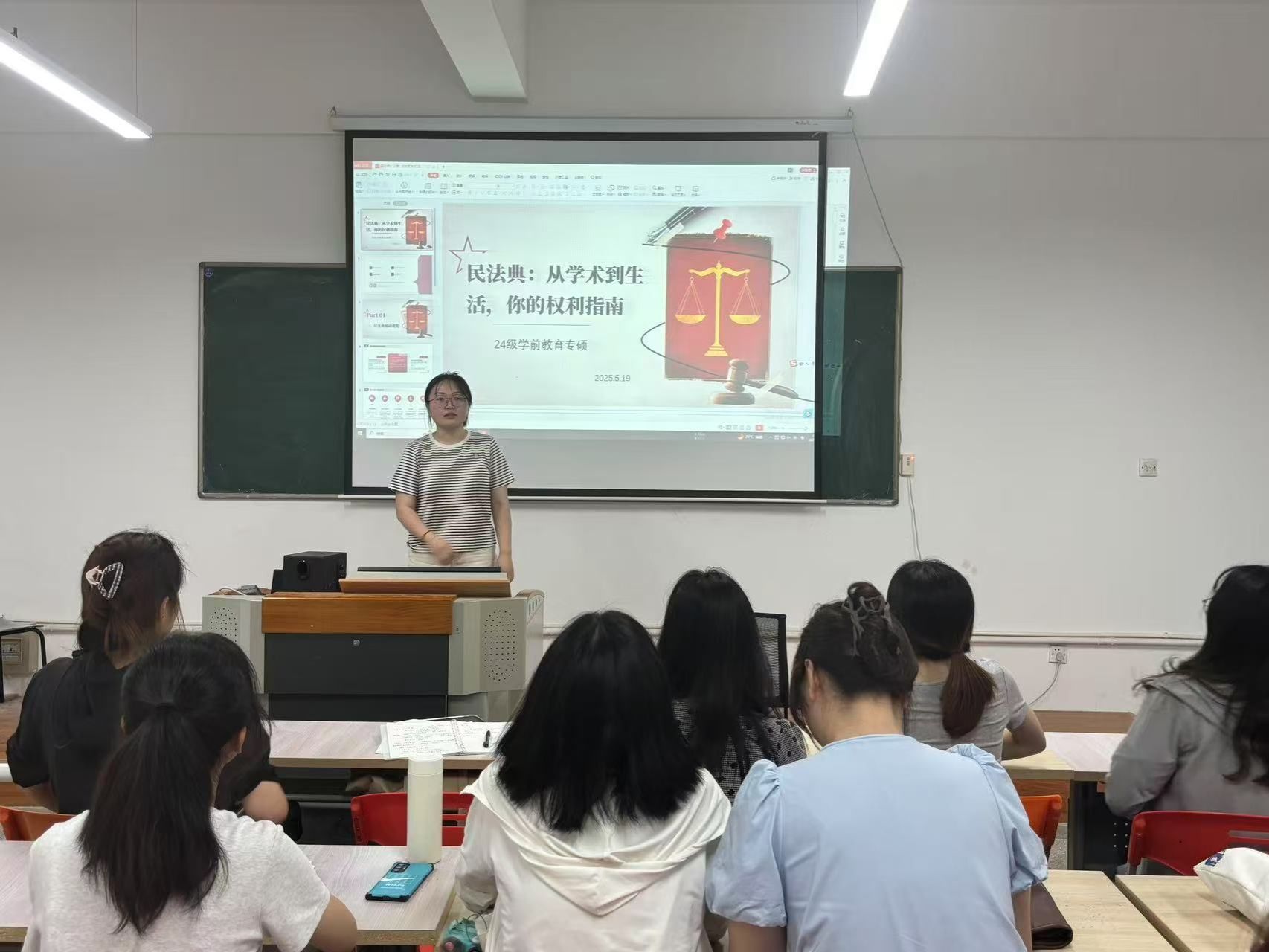 2023级教育学学硕班聚焦教育法治建设,举办“民法典与教育治理”专题学术沙龙。同学们结合教育法、未成年人保护法等法律法规,深入探讨校园伤害事故责任认定、教育机构注意义务等实务问题。2024级教育学学硕班通过案例讲解帮助学生运用法律解决实际问题,同时引导树立正确行为准则,减少校园纠纷,提升自我保护能力,营造和谐安全的校园环境。2024级学前教育专硕班级围绕“民法典:从学术到生活,你的权利指南”主题,开展了一场集体学习活动。2024级应用心理学班级通过案例研讨、情景模拟等形式,深入探讨民法典与青少年权益保护的紧密联系。2024级心理健康教育班级通过深入解读民法典知识、结合实际案例分析,为同学们带来了一场生动的法治教育课。