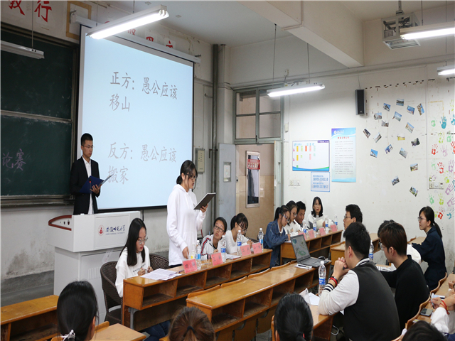 第一场辩论赛的辩题是:愚公应该移山还是应该搬家。主持人宣布本场辩论赛正式开始。比赛伊始,正反双方一辩在三分钟的时限内表明立场,开始立论陈词。正方一辩首先肯定愚公应该移山,因为这是一劳永逸的方法,并引经论典进行立论;而反方一辩提出愚公应该搬家,因为这是最直接、最理智的方式。双方都侃侃而谈,自由发表本方的观点。紧接着是攻辩和自由论辩环节,双方辩手在坚持己方的立场上,从容回击,博得观众的阵阵掌声。最后,双方四辩对各自的论述进行总结,并回答观众的疑问。第一场辩论赛完美结束。
