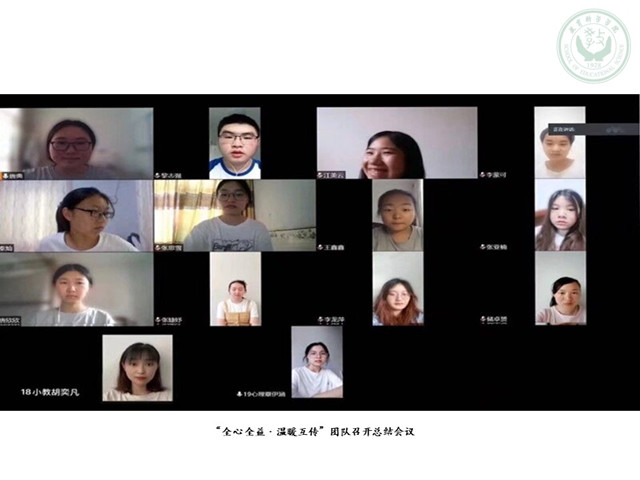 8月20日下午3点30分,教科院“全心全益?温暖互传”心理健康教育云端团队队长唐典在召开了团队分享会议,每位队员都积极分享了自己在这次活动中遇到的困难,授课中的收获和对活动的期望。疫情下特殊的线上宣讲形式,忙碌充实的云端授课过程,幸福美好的接触经历,都给队员们带来了温暖而独特的体验。分享会议结束后,大家共同喊出了“全心全益,温暖互传”的口号,满怀不舍挥别暑期实践生活,踏上新的征程。
