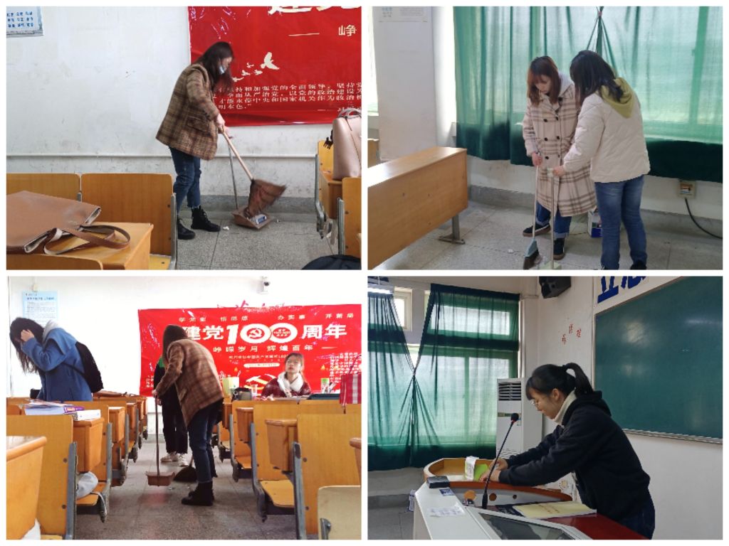 为响应雷锋月,支部成员组织了教室志愿清扫服务。8303教室是学前教育专业考研常用复习教室,第三党小组成员在不打扰同学们备考的前提下,认真打扫教室卫生,为同学们带来干净整洁的备考环境。
