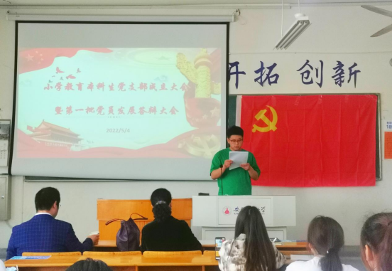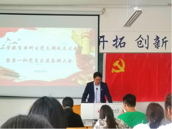 新起点开启新征程。2022年5月4日,教育科学学院小学教育本科生党支部成立大会暨第一批党员发展答辩大会在田楼8301教室举行。支部书记莫大贡主持会议,院党委委员、行政院长何海燕,支部副书记梁冬及全体党员和部分入党积极分子参加会议。