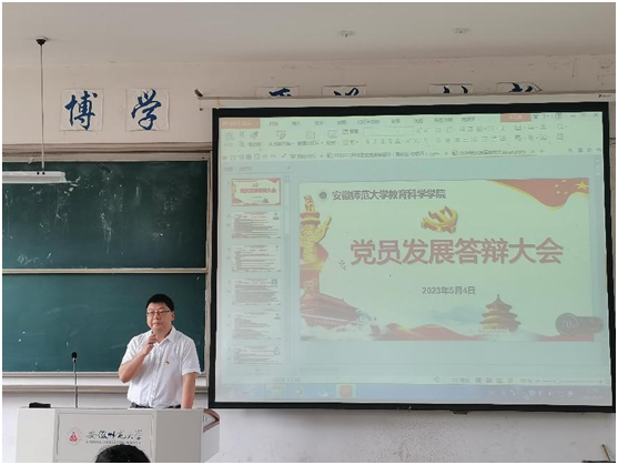 5月4日中午,教育科学学院党委举办2023上半年研究党员发展答辩大会。教育学、心理学、教育技术学、教育硕士四个研究生党支部共16位入党积极分子参加此次答辩,学院党委书记许国飞、院长李宜江、副院长韩建涛、吴文涛、学院组织员兼党委秘书袁黎平,研究生党支部副书记丁晓云、王礼军及相关辅导员出席答辩大会并担任答辩评委,答辩大会由教育硕士研究生党支部书记李昊主持,四个支部全体党员、预备党员及部分入党积极分子参与现场评议工作。