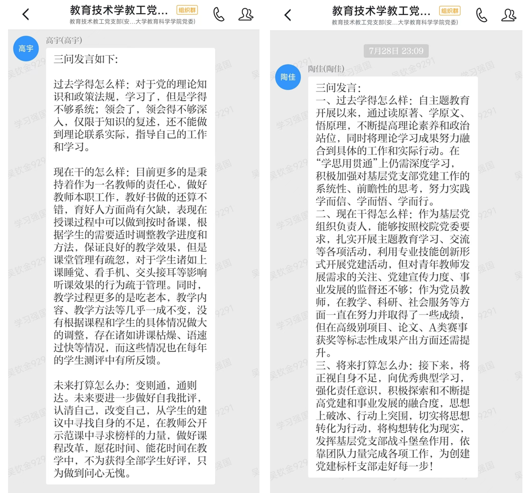 陶佳和高宇两位同志分别结合自身工作围绕从“过去学得怎么样、现在干得怎么样、将来打算怎么办”三个方面进行了交流并在学习强国平台支部群发言。