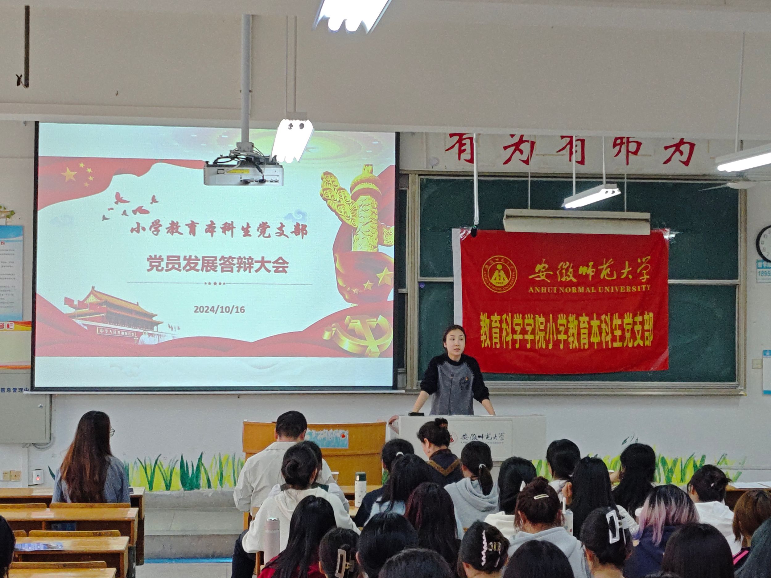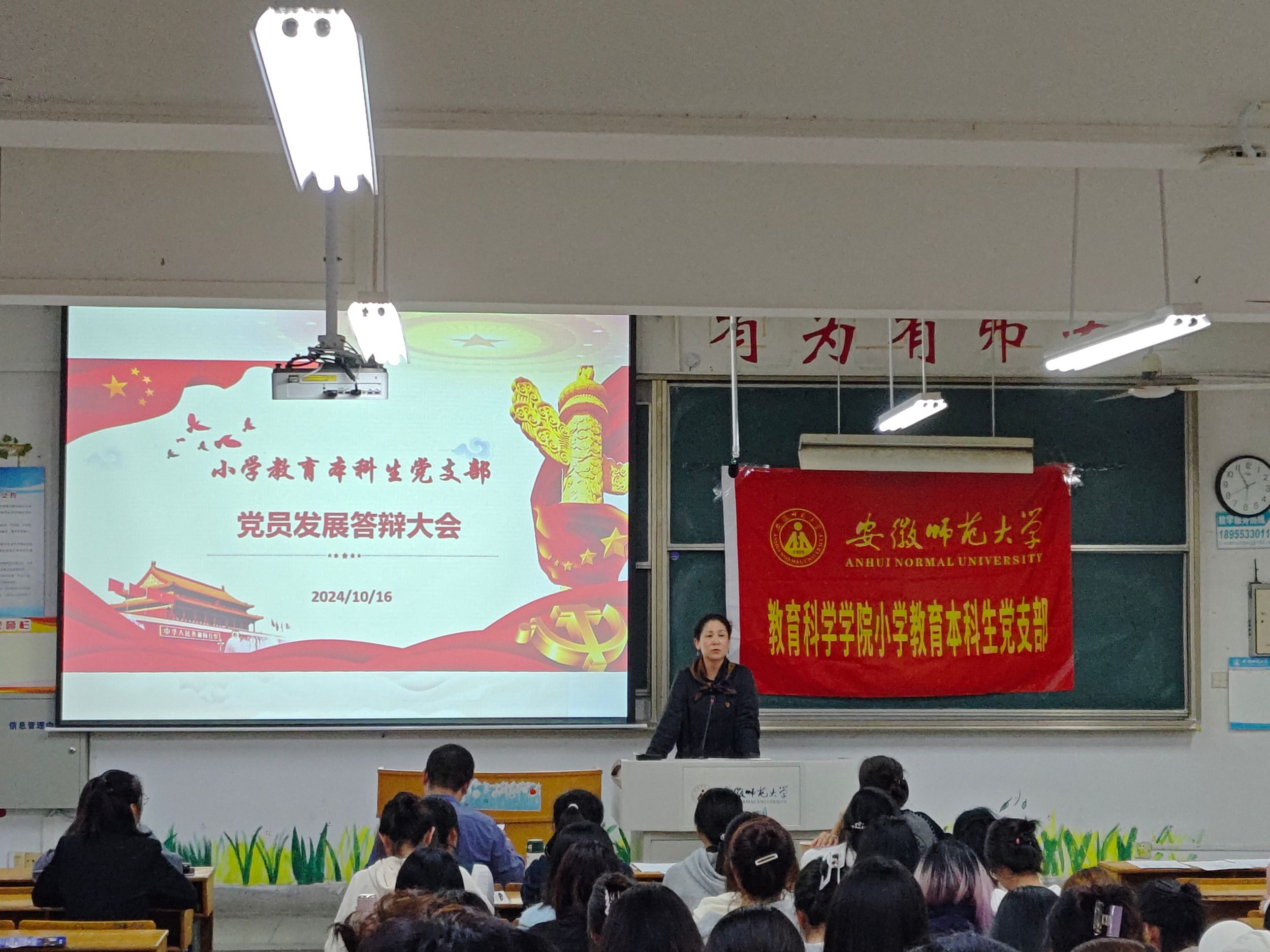 为进一步贯彻落实《中国共产党发展党员工作细则》相关规定,提高党员队伍的整体素质,2024年10月16日下午,教育科学学院小学教育本科生党支部于田楼8308教室召开了2024年下半年党员发展答辩大会。小学教育本科生党支部书记程雅楠主持会议,教育科学学院党委委员、行政院长何海燕,小学教育本科生党支部副书记莫大贡作为教师组参与现场答辩打分,支部全体学生党员、入党积极分子参与现场评议工作。
