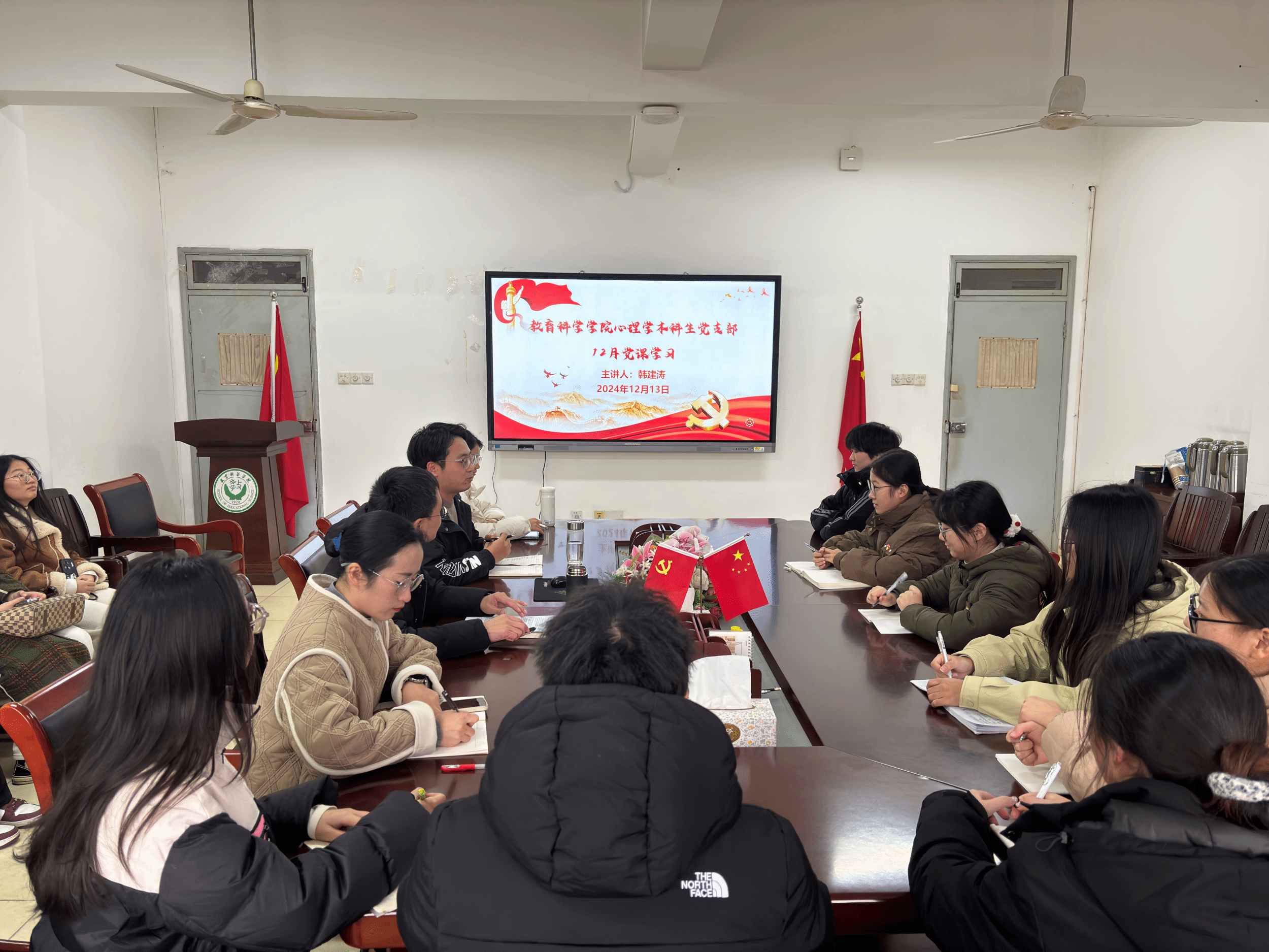 在主题党课上,韩建涛带领支部党员学习了历次全国教育大会的召开情况和重要意义,重点介绍了习近平总书记在2024年全国教育大会上的重要讲话精神。他围绕“教育强国建设的宏伟蓝图”“立德树人与人才培养新模式”“科教融合与创新驱动发展”“教育公平与数字化战略”“教师队伍建设与教育家精神”等方面,进一步分析心理学专业今后的发展前景。随后,韩建涛向支部党员介绍了学校“三大行动计划”的预期目标和具体举措,呼吁支部党员践行当代心理学专业大学生“博览众长,练好内功;友爱互助,健康成长;关心国计,融入社会;相信自己,勇于创造”的使命担当。与会党员认真学习并记录相关内容,深刻理解了全国教育大会精神的重要意义。